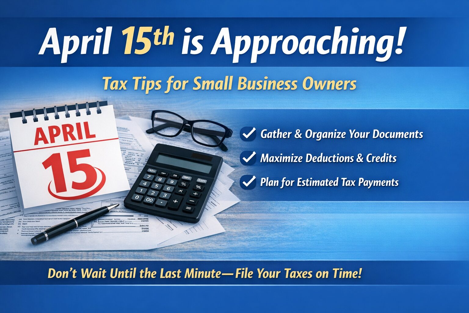 The April 15 tax deadline is quickly approaching, and for many small business owners, this time of year can feel overwhelming. Taking a few proactive steps now can help you avoid penalties, reduce stress, and ensure your return is filed accurately and on time.